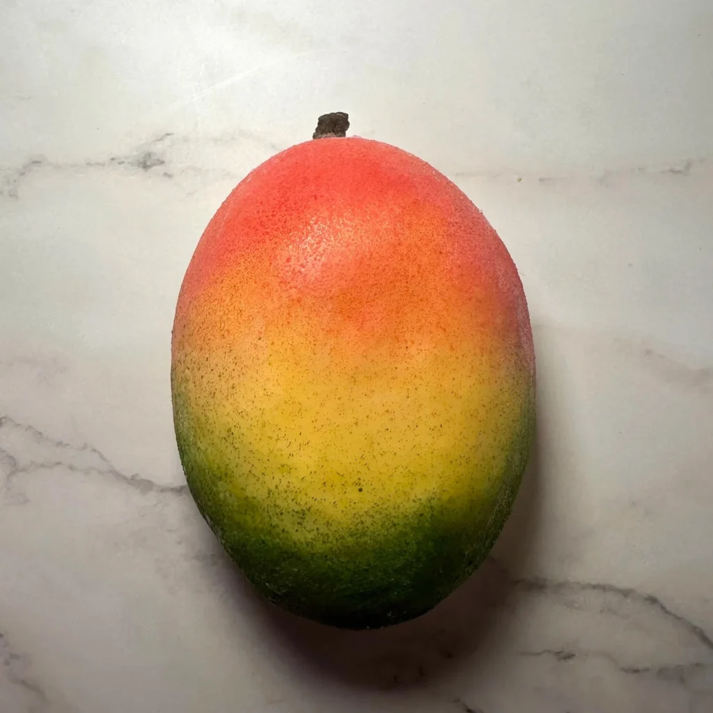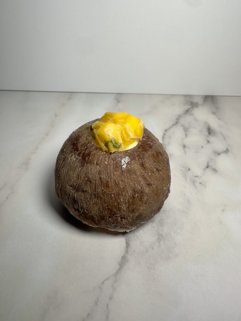 Vanilla cream with a passion mango curd insert and fresh mango chunks, vanilla sponge, enclosed in a smooth white chocolate shell