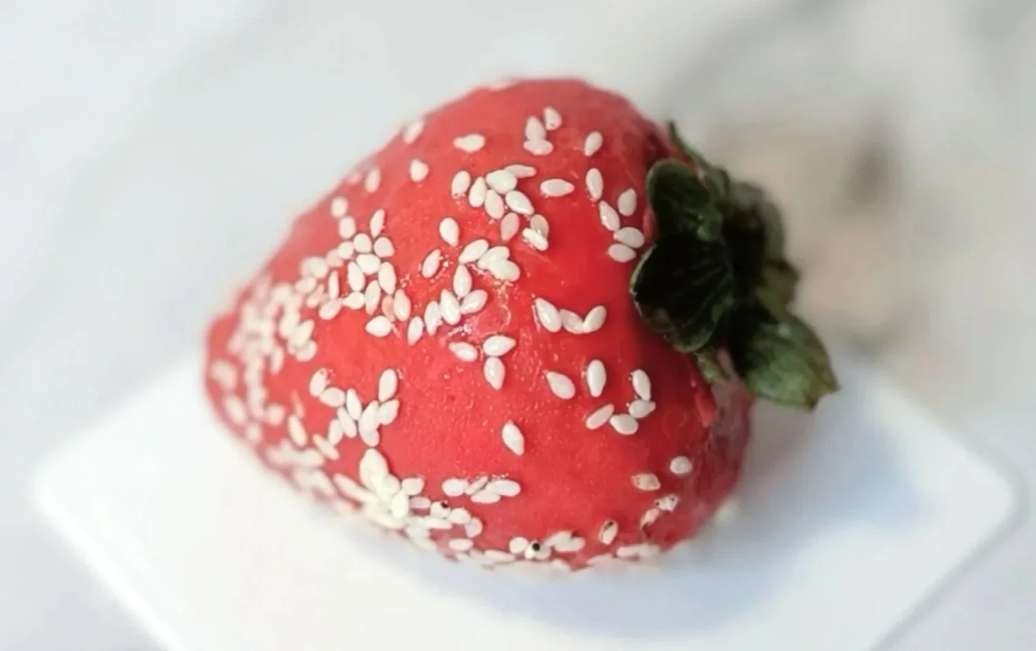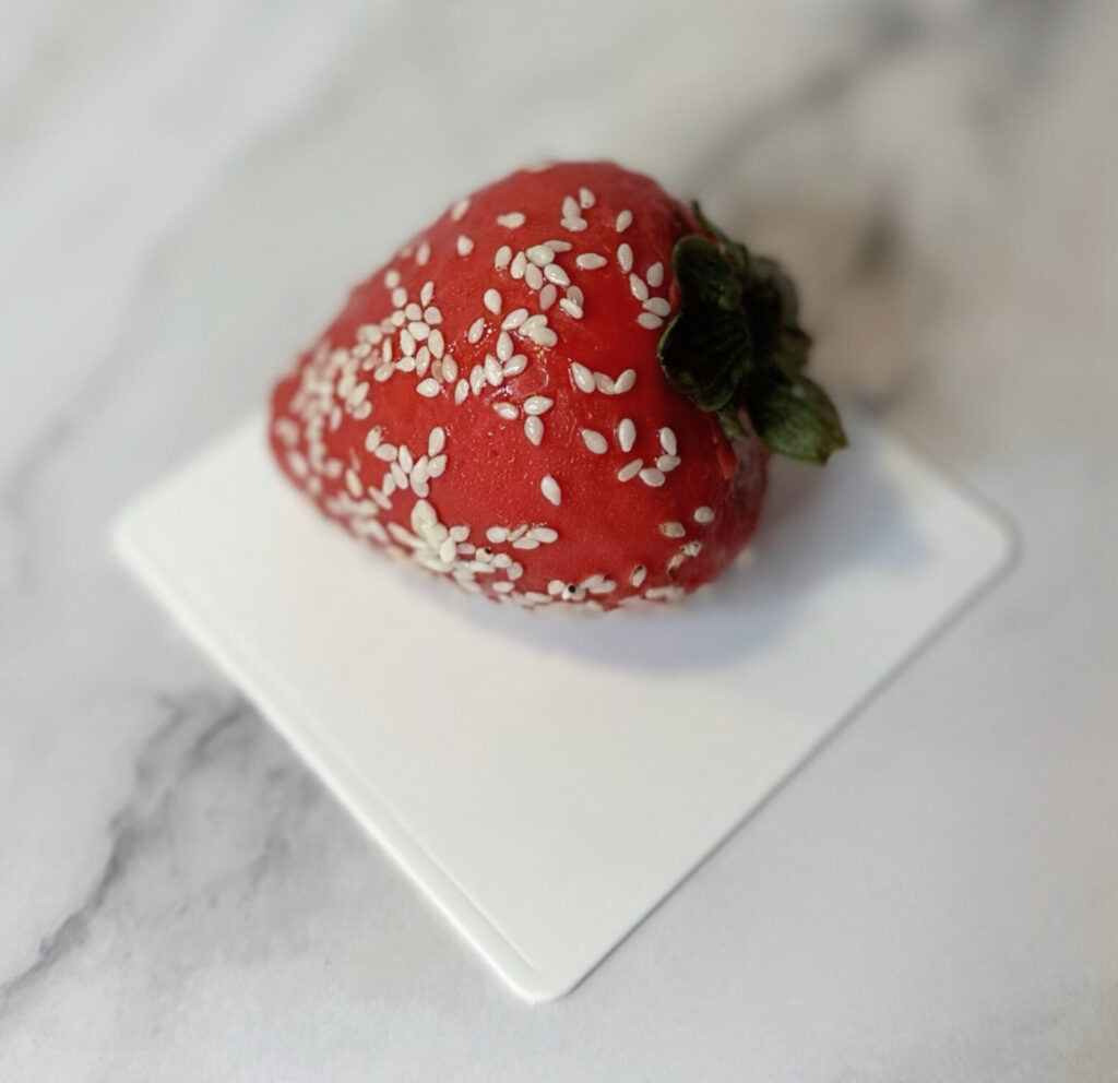 Strawberry insert with fresh strawberry pieces, light vanilla cream, vanilla biscuit base in a strawberry-shaped chocolate shell sprinkled with sesame seeds