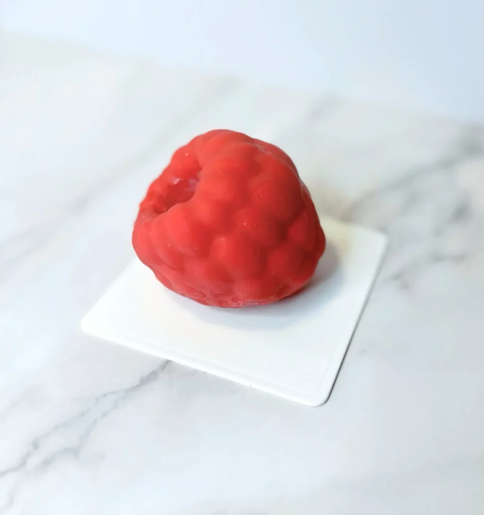 Raspberry curd insert, fresh raspberry bits, vanilla cream, vanilla biscuit, wrapped in a delicate chocolate shell.