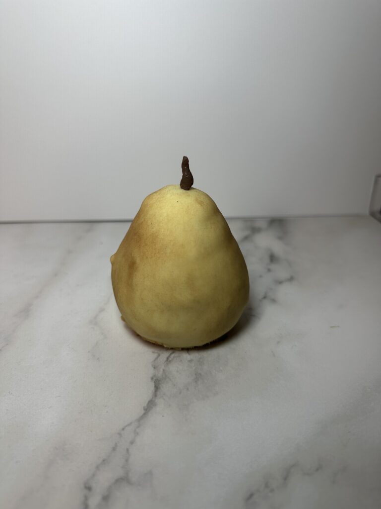 Milk chocolate cream with a pear puree insert, vanilla biscuit, enclosed in a smooth white chocolate shell