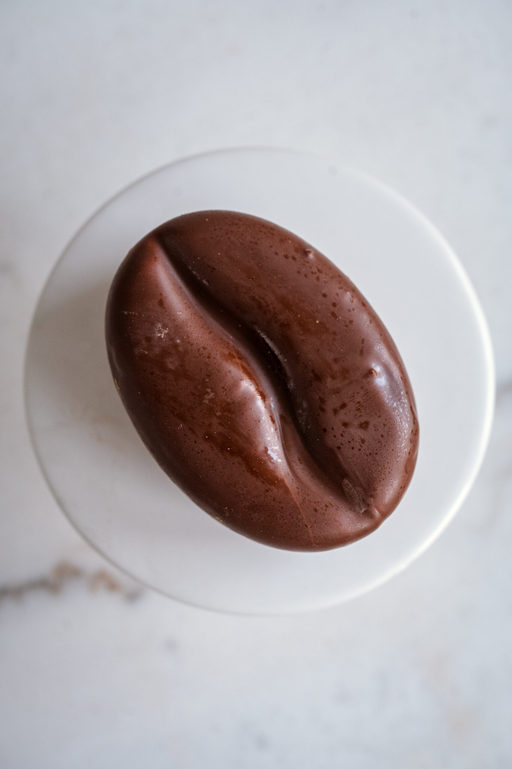 Vanilla-coffee mascarpone cream, pecan praliné, caramelized pecans, and coffee-soaked ladyfinger, captured in a glossy dark chocolate shell