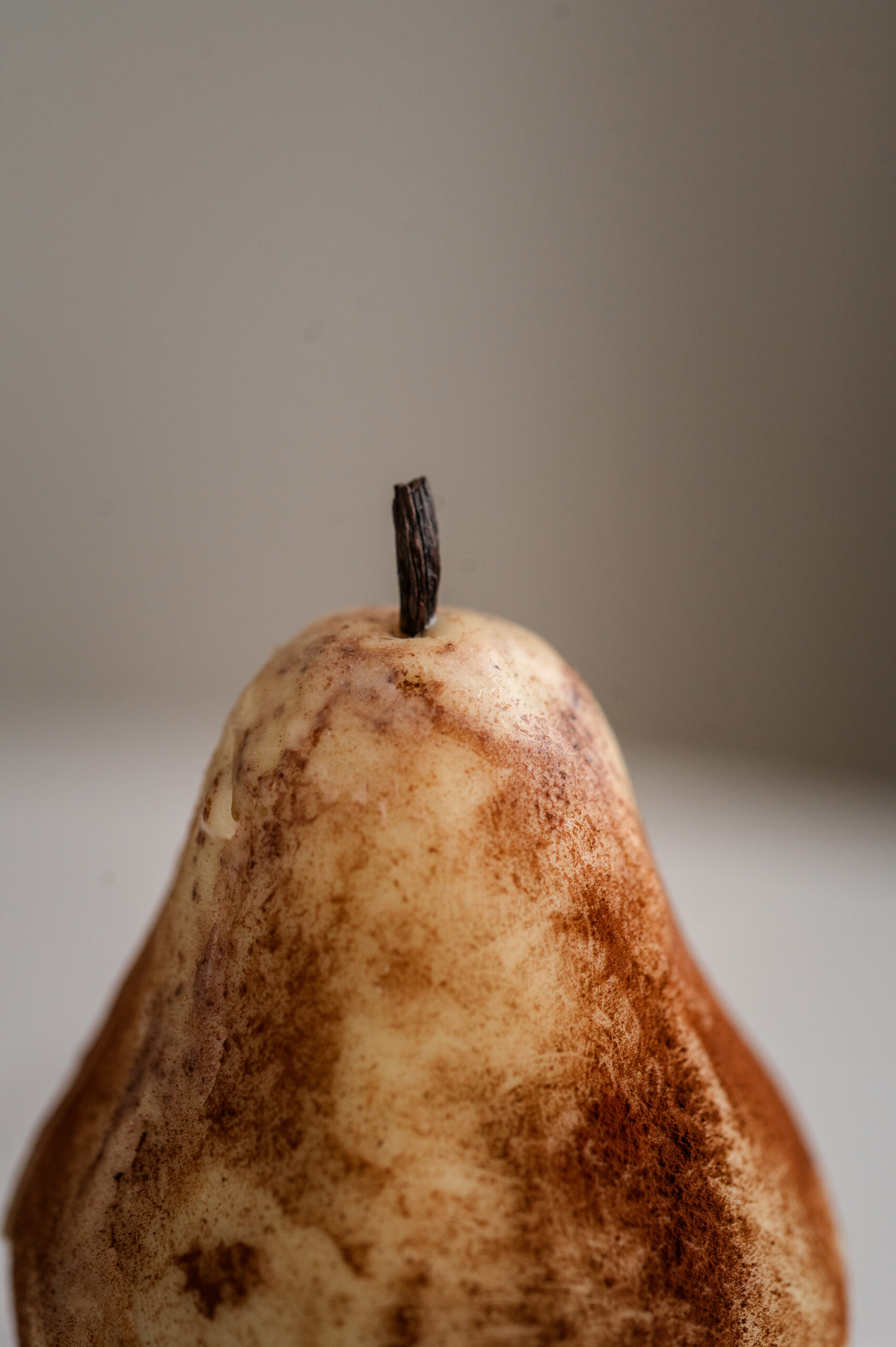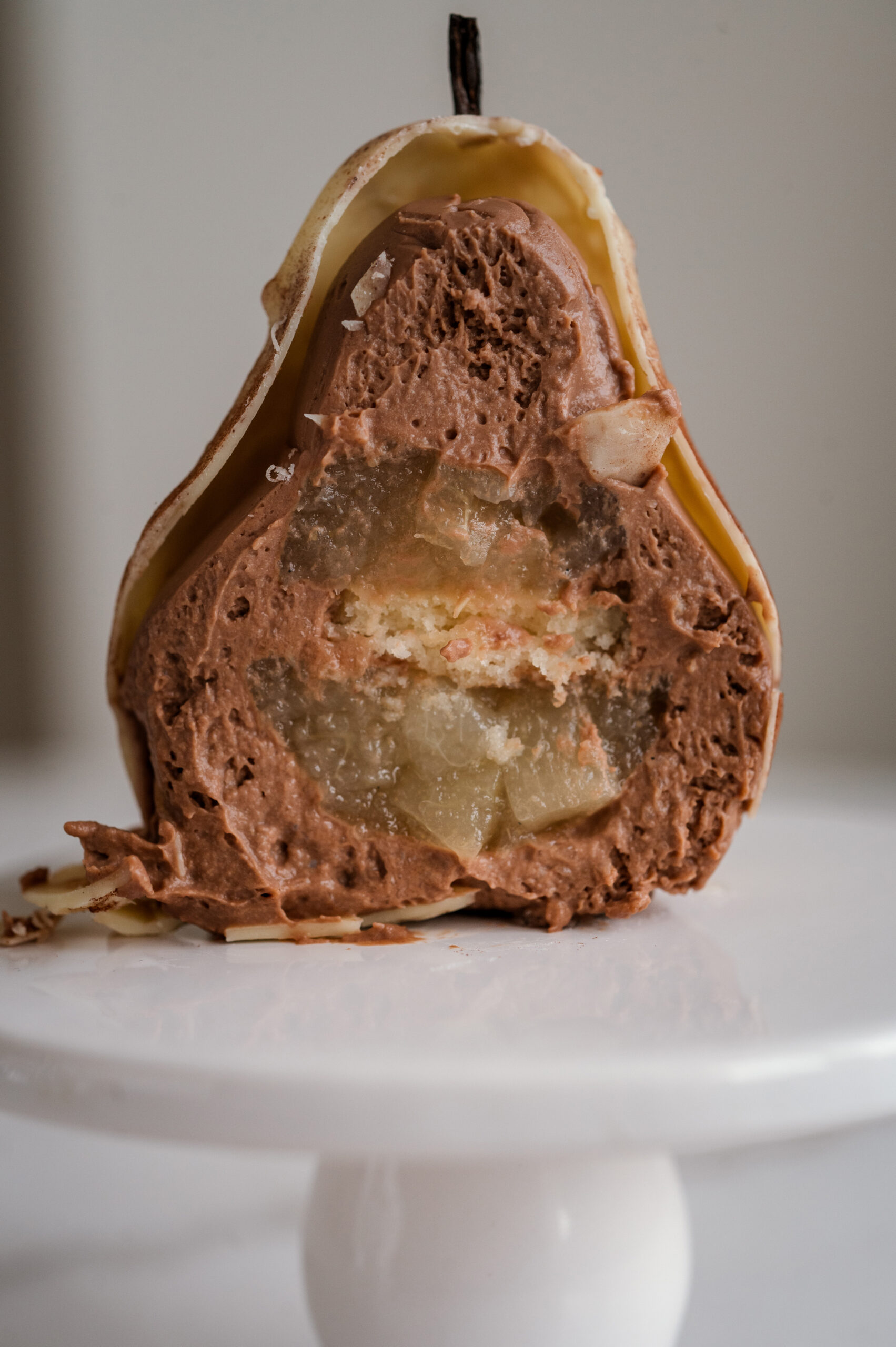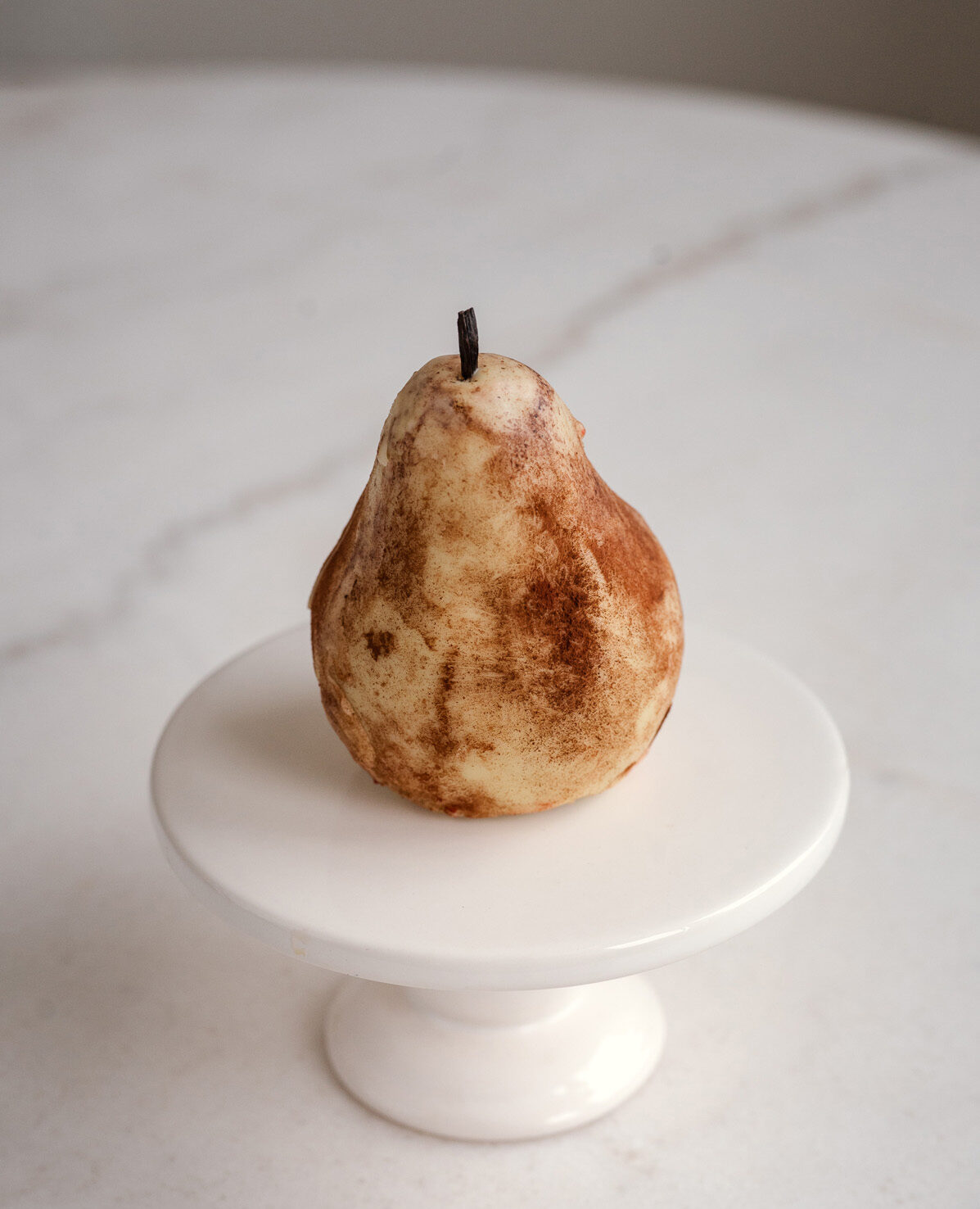 Milk chocolate cream with a pear puree insert, vanilla biscuit, enclosed in a smooth white chocolate shell
