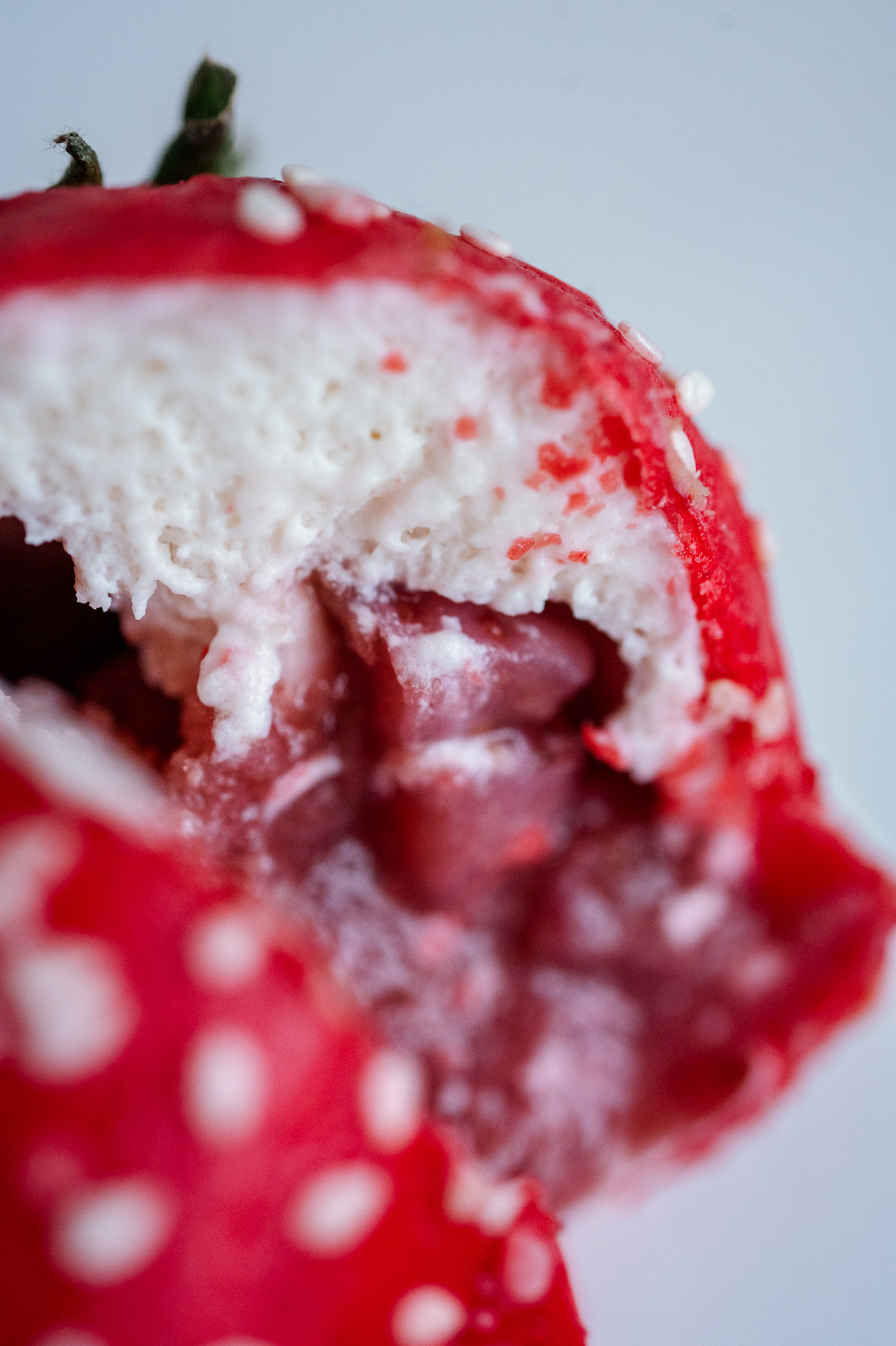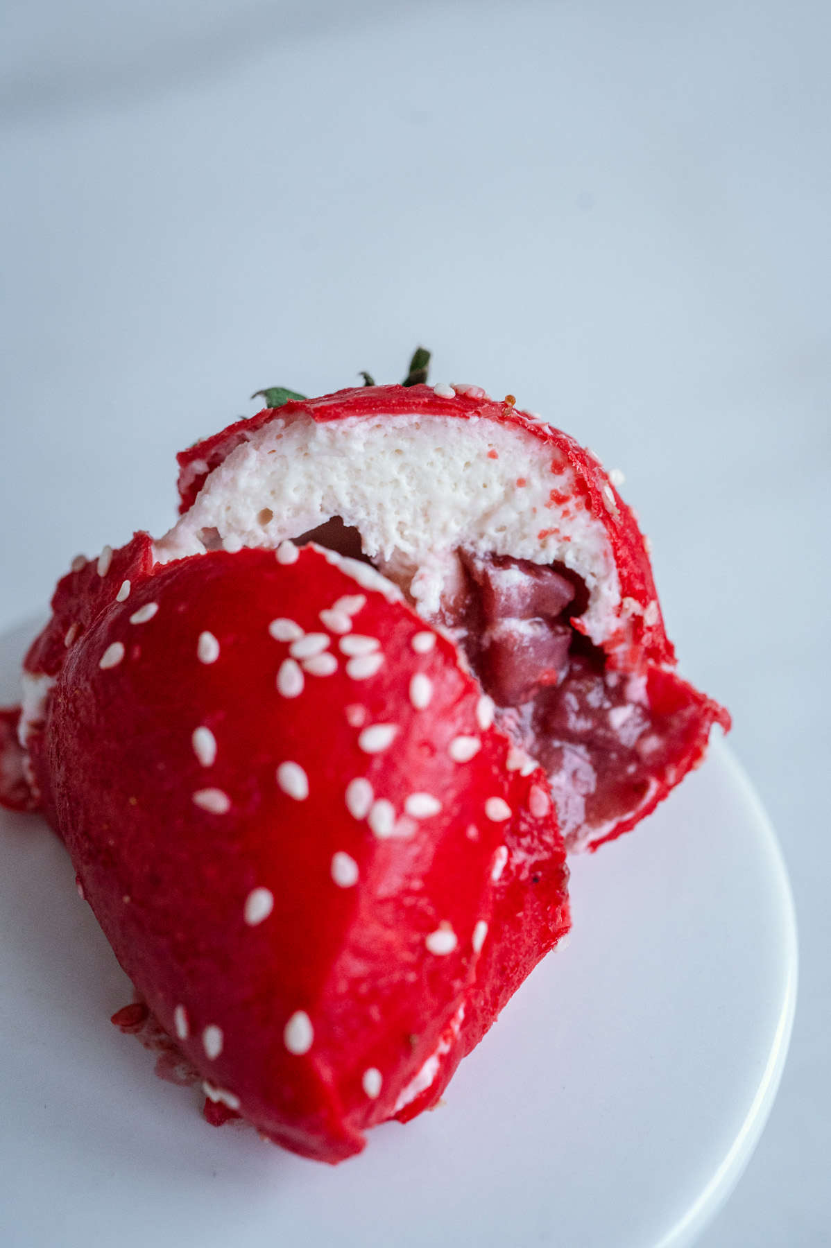 Strawberry insert with fresh strawberry pieces, light vanilla cream, vanilla biscuit base in a strawberry-shaped chocolate shell sprinkled with sesame seeds